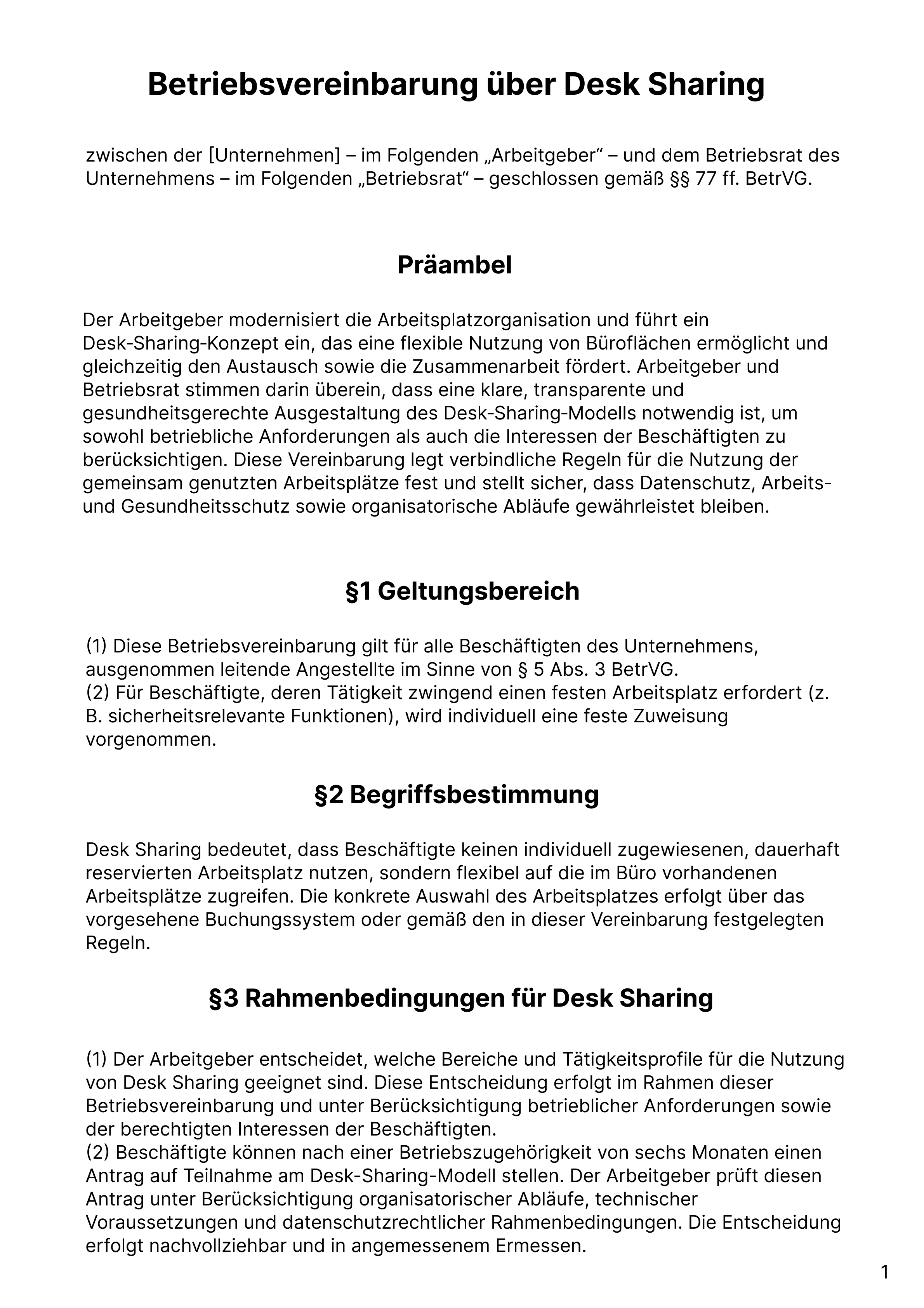 Der erste Abschnitt einer Betriebsvereinbarung sollte das Desk Sharing Konzept des Unternehmens klar definieren und die verfolgten Ziele benennen: