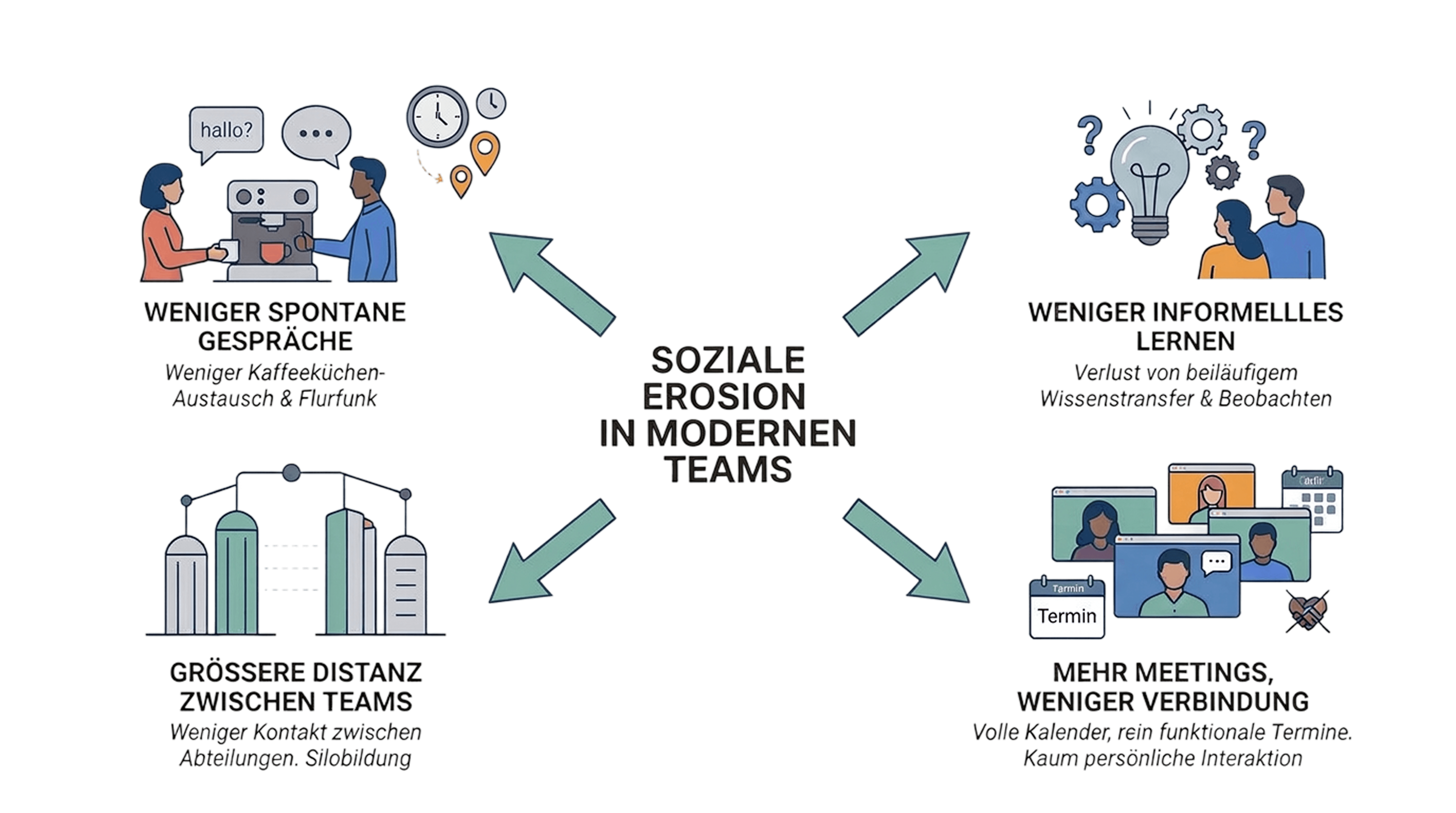 Abteilungen oder Projektgruppen, die früher im selben Bürobereich gearbeitet haben, verlieren schneller den Kontakt. Ohne regelmäßige Begegnungen entstehen leichter Silos.Mehr Meetings, weniger Verbindung