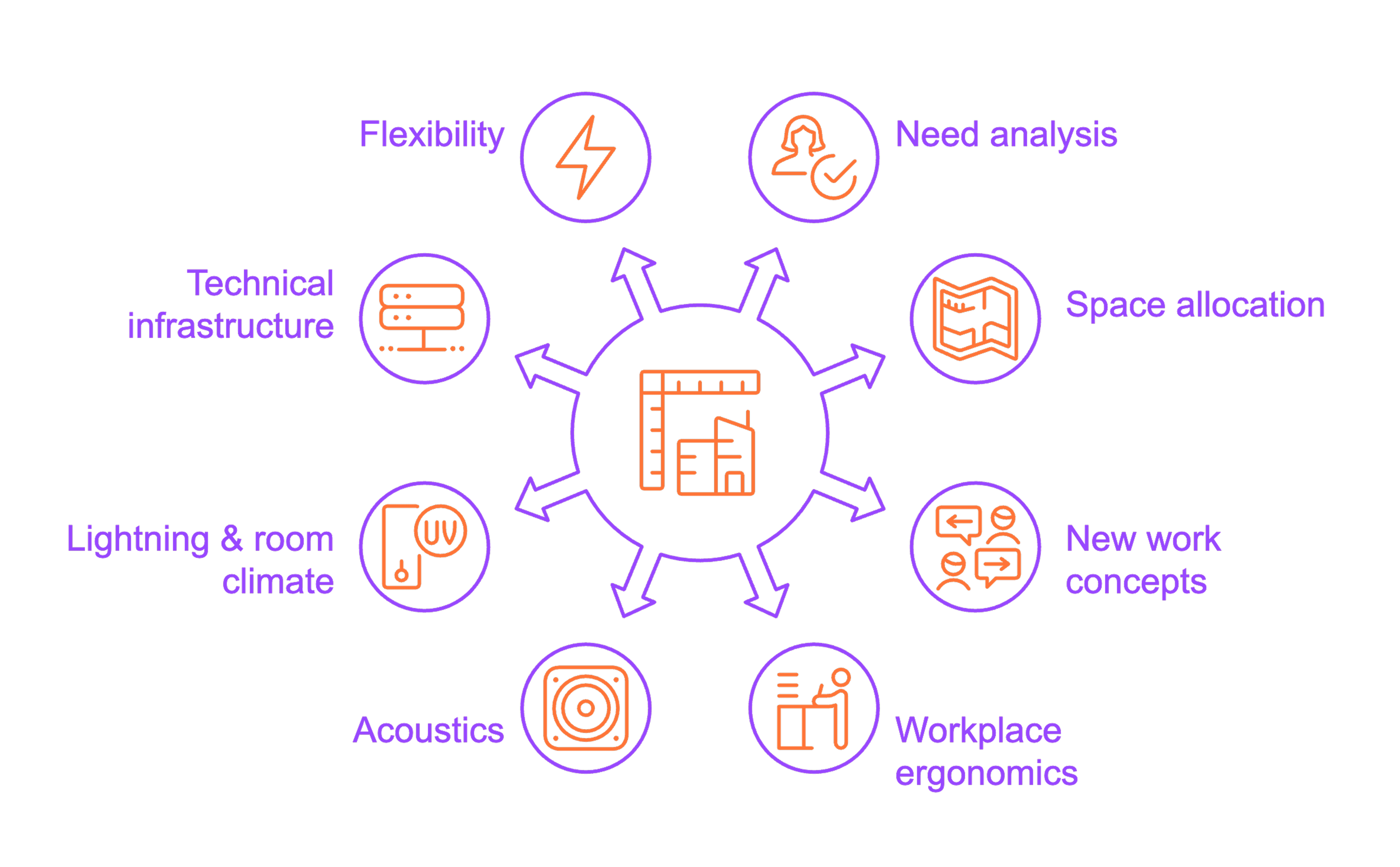 Start with a systematic recording of work tasks, work organization, and communication needs within your company. Also consider the proportion of fieldwork and home office, as well as future development options. A thorough needs analysis prevents costly misplanning and ensures that the new design optimally fits your corporate culture.