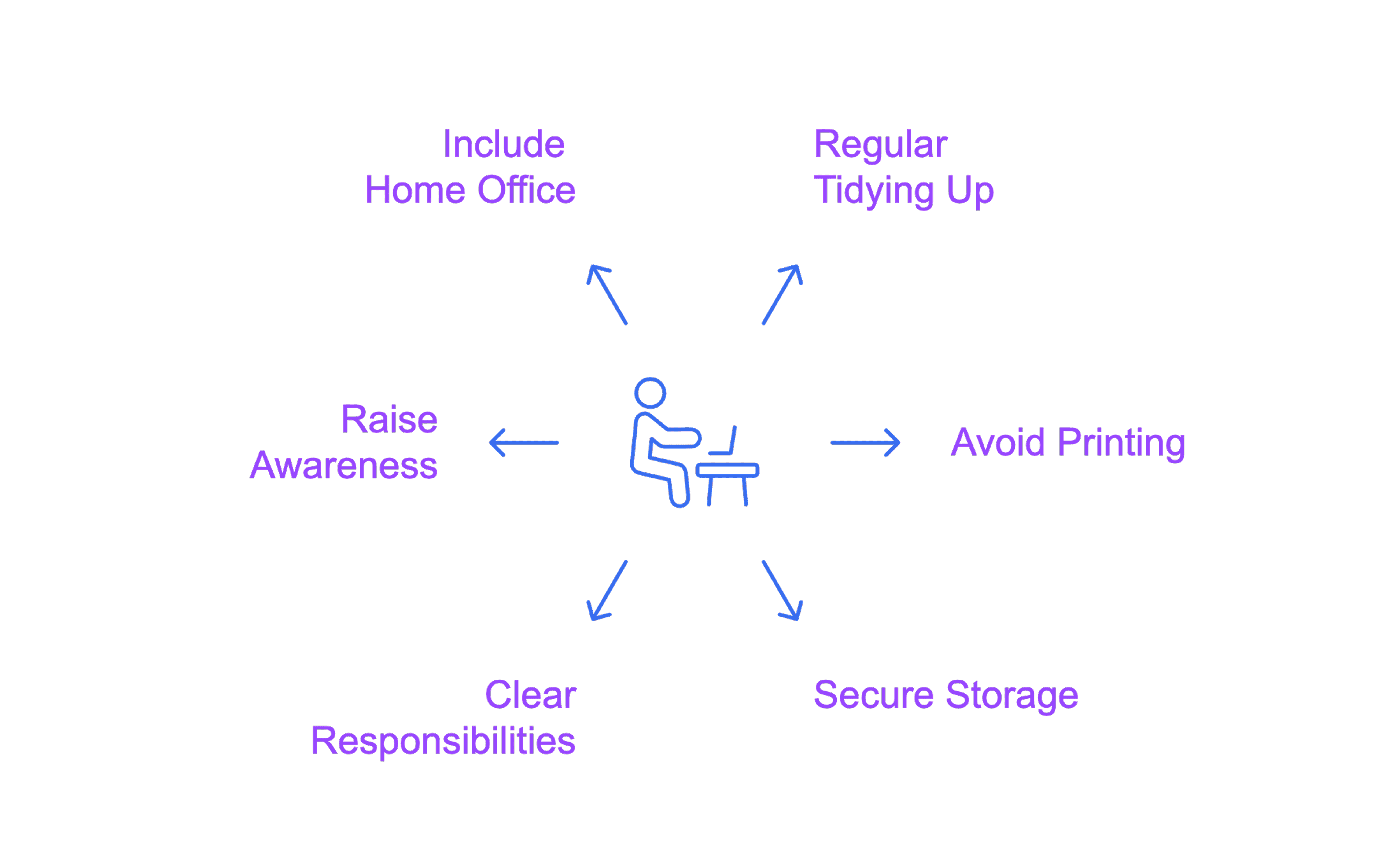 Regular Tidying Up: Employees should allocate a few minutes at the end of each workday to tidy their workspace. This includes removing stacks of paper, securely storing documents, and locking cabinets.