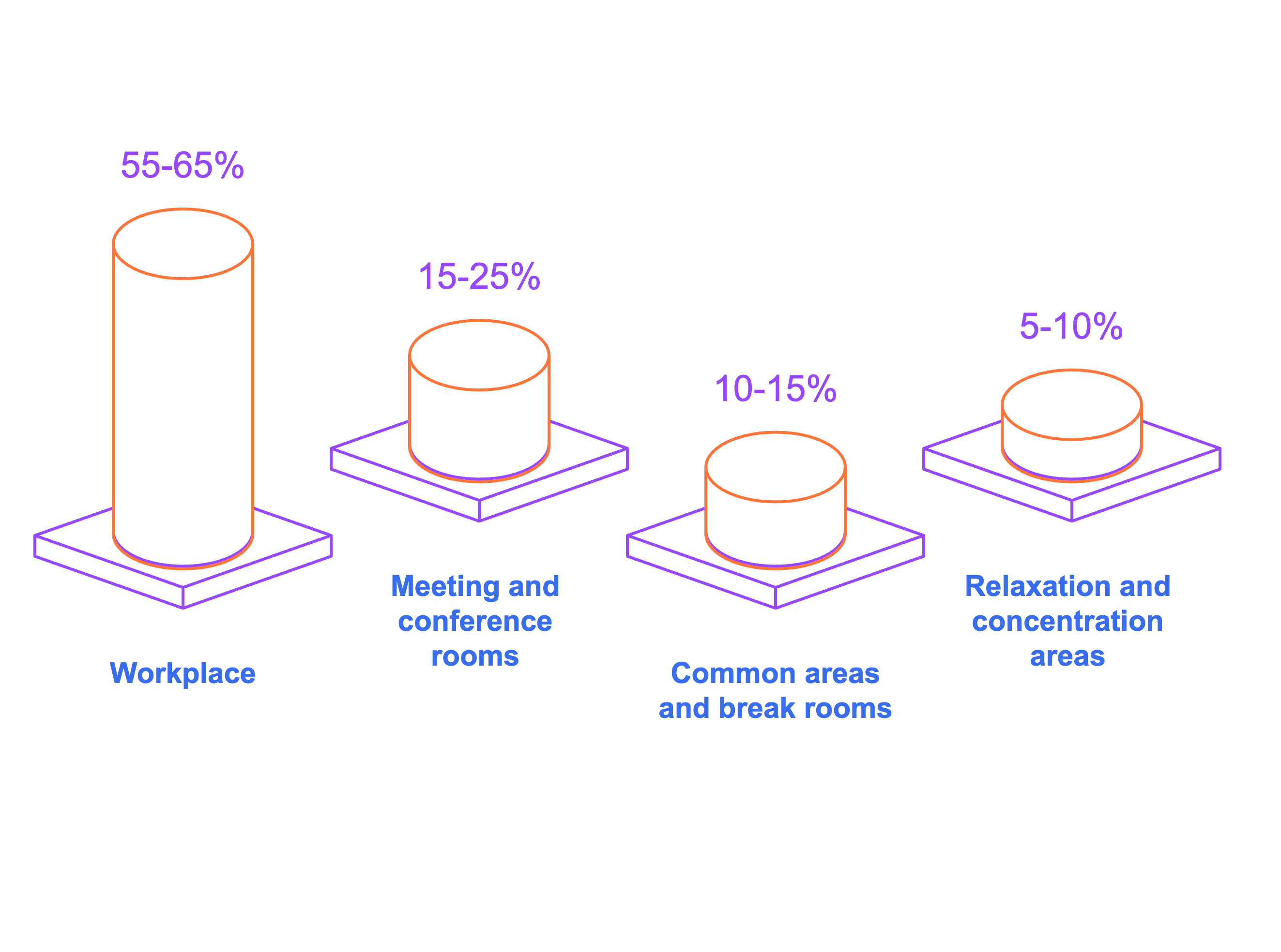 The main portion of office space is dedicated to actual workstations. This zone includes both fixed desks and flexible workspaces in hybrid work models. For a team of 50 people in an 800 sqm office, for example, 480-520 sqm would be reserved for workspaces.
