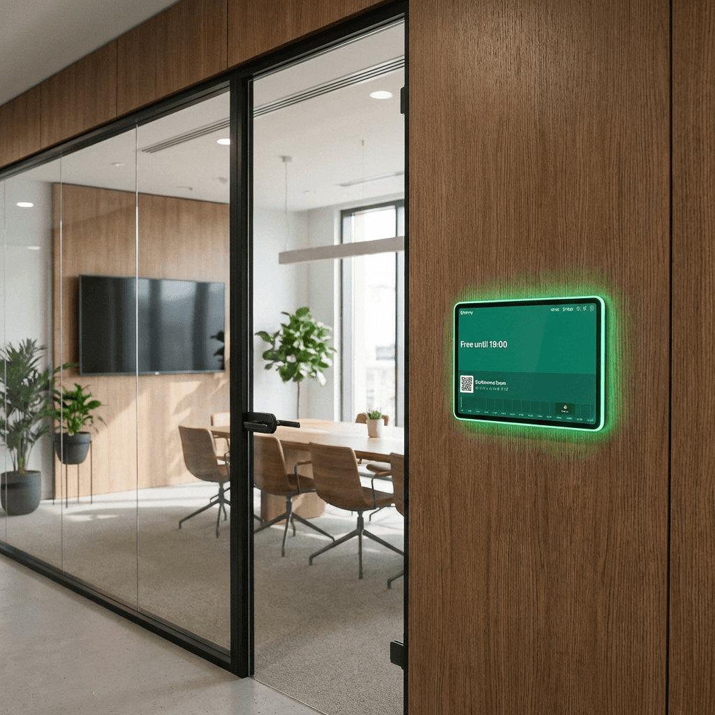An integrated LED strip in the panel PCs visually indicates the current room status. Users can immediately see whether a room is available, occupied, or soon to be reserved.