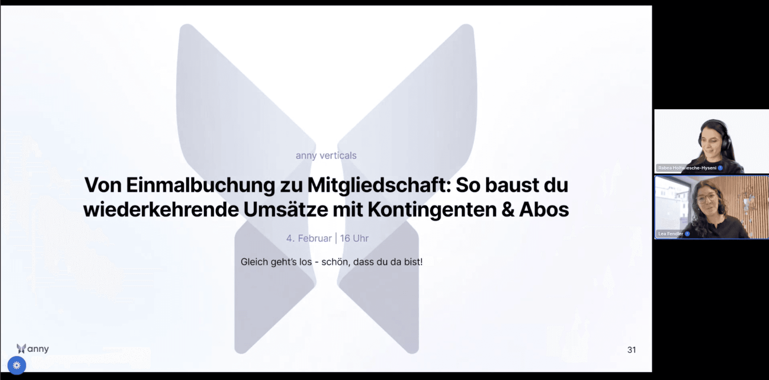 In diesem Webinar lernst du, wie du mit Abos, Kontingenten und Communities sporadischen Buchungen in langfristige Kundenbeziehungen umwandelst. Wir zeigen dir, wie du mit anny regelmäßige Einnahmen schaffst und dein Angebot strategisch strukturierst.