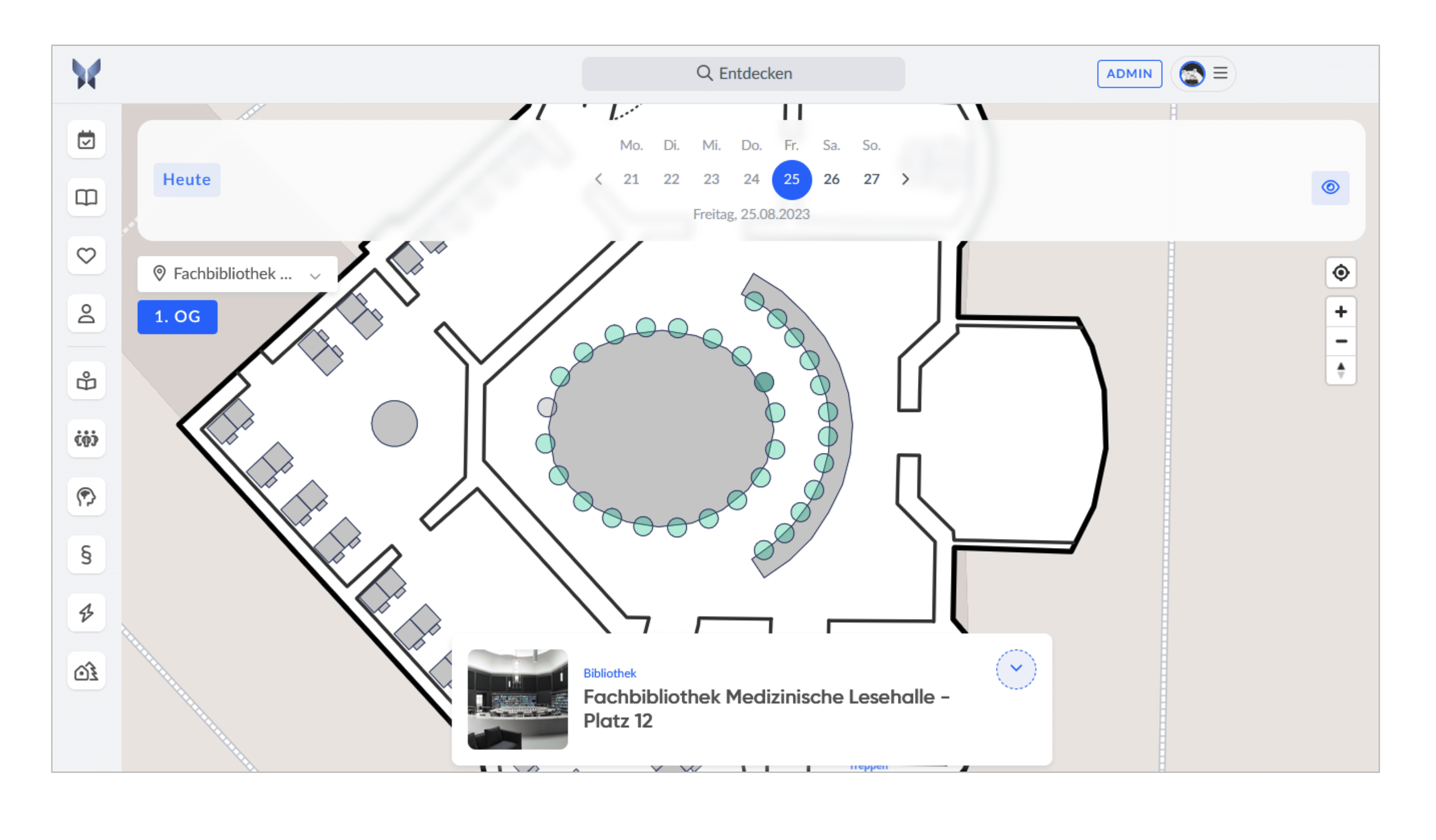 Via l’application, les utilisateurs voient immédiatement quelles places ou salles de groupe sont disponibles pour leur communauté et peuvent les réserver. Les réservations spontanées sur place sont également possibles ; les places de lecture réservables sont signalées par un support avec code QR. Dans les deux cas, la présence doit être confirmée via l’application ou un lien e-mail. Les réservations expirées sont automatiquement remises à disposition.